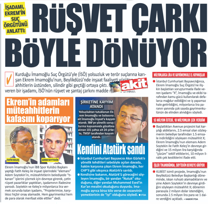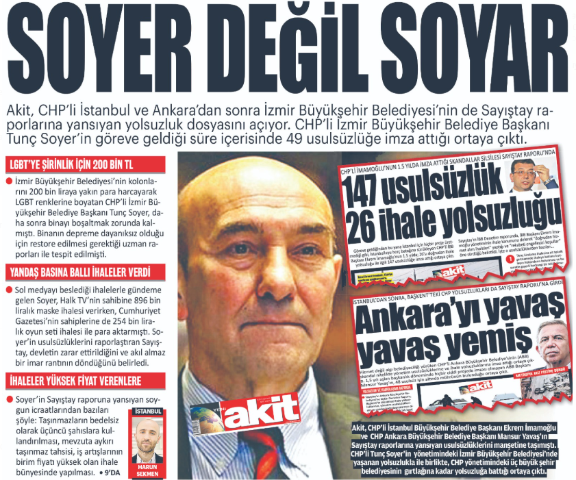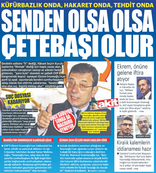 ‘Senden olsa olsa çete başı olur’, ‘Kirli para kirli siyaset’, ‘Organize sahtekârlık’, ‘Ağaç A.Ş’yi iyi çapalamışlar’ manşetleriyle daha İBB’ye yönelik operasyon başlamadan günler önce CHP’li Ekrem İmamoğlu’nun örgüt elebaşı olduğunu ifşa eden akit, malum zihniyetçe hedef tahtasına oturtuldu. Akit’in İBB’de dönen vurgun çarkına ve İstanbul’u ahtapot gibi saran Ekrem İmamoğlu ile adamlarına yönelik haberlerinden rahatsız olan CHP’nin kiralık kalemleri ve Haraçhane medyası sosyal medya platformlarında çok kirli bir saldırı kampanyası başlattı.
