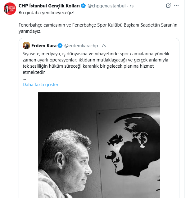 CHP Gençlik Kolları’nın resmi sosyal medya (X) hesabından yapılan paylaşımda, ağır bir suçlamayla karşı karşıya olan Saran’a açıkça sahip çıkıldı. Paylaşımda, "Bu girdaba yenilmeyeceğiz! Fenerbahçe camiasının ve Fenerbahçe Spor Kulübü Başkanı Sadettin Saran’ın yanındayız" ifadeleri kullanıldı.