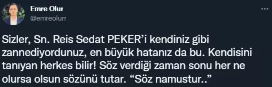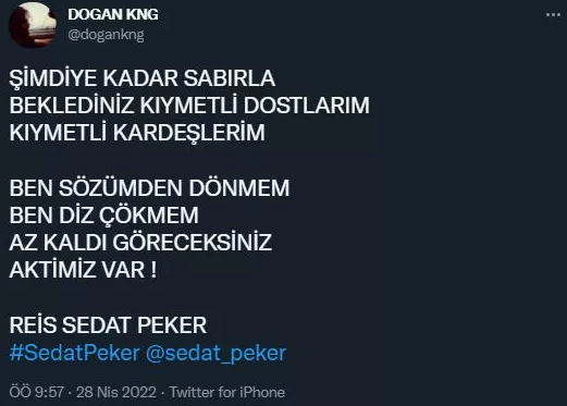 Öte yandan 'Doğan Kng' adlı bir Twitter kullanıcısı, mesajjında, "Şimdiye kadar sabırla beklediniz kıymetli dostlarım, kıymetli kardeşlerim. Ben sözümden dönmem ben diz çökmem az kaldı göreceksiniz vaktimiz var. Reis Sedat Peker.” ifadelerini kullandı.