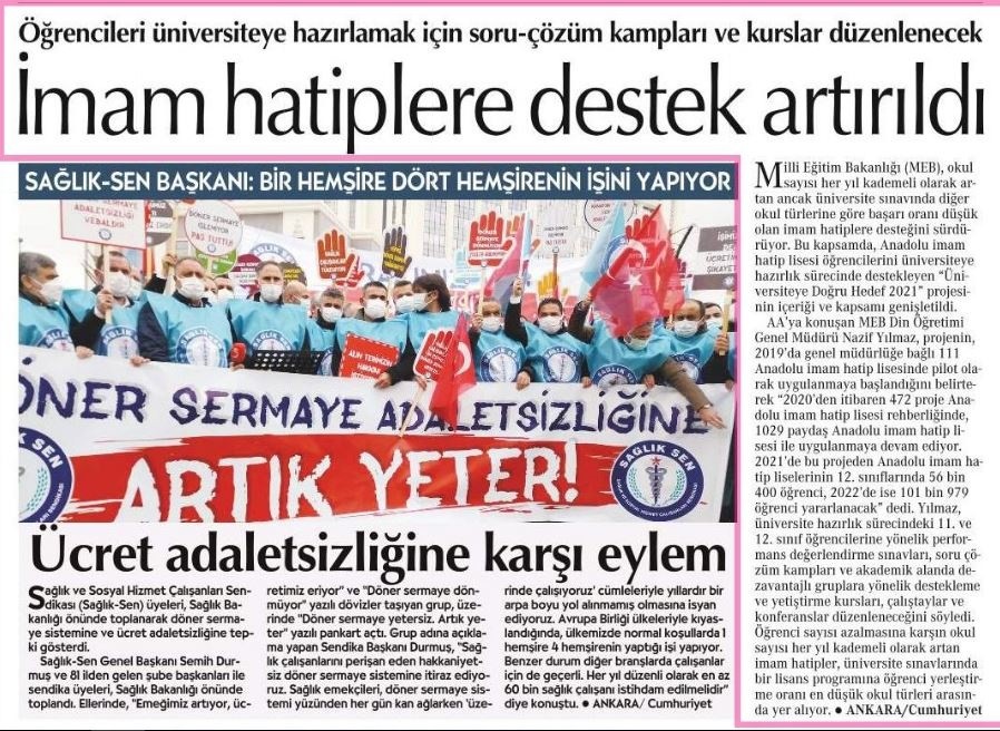 Bugünkü gazete manşetinde "İmam Hatiplere destek artırıldı" başlığını atan Cumhuriyet, akılalmaz bir şekilde imam hatip liselerinin başarı oranının diğer okul türlerine göre daha düşük olduğunu ileri sürdü.