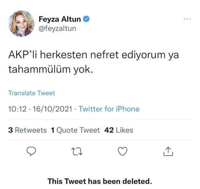 Geçmişte CHP Kadın Kolları Başkanlığına da aday olan Feyza Altun, sosyal medya hesabı üzerinden paylaştığı bir mesajda, "AKP'li herkesten nefret ediyorum ya tahammülüm yok" ifadelerini kullandı.