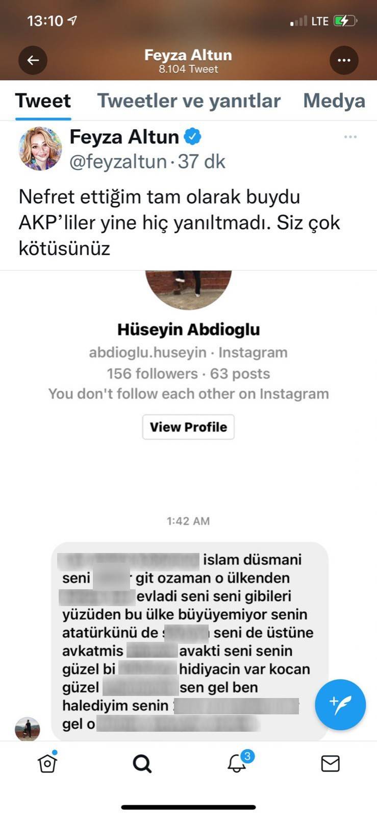 Kendisine Instagram üzerinden "özel mesaj" olarak gönderilen bir hakaret metnini "AK Parti'liler" göndermiş gibi sunan Altun, sildiği paylaşımdaki nefret söylemine bu şekilde gerekçe oluşturmaya çalıştı.