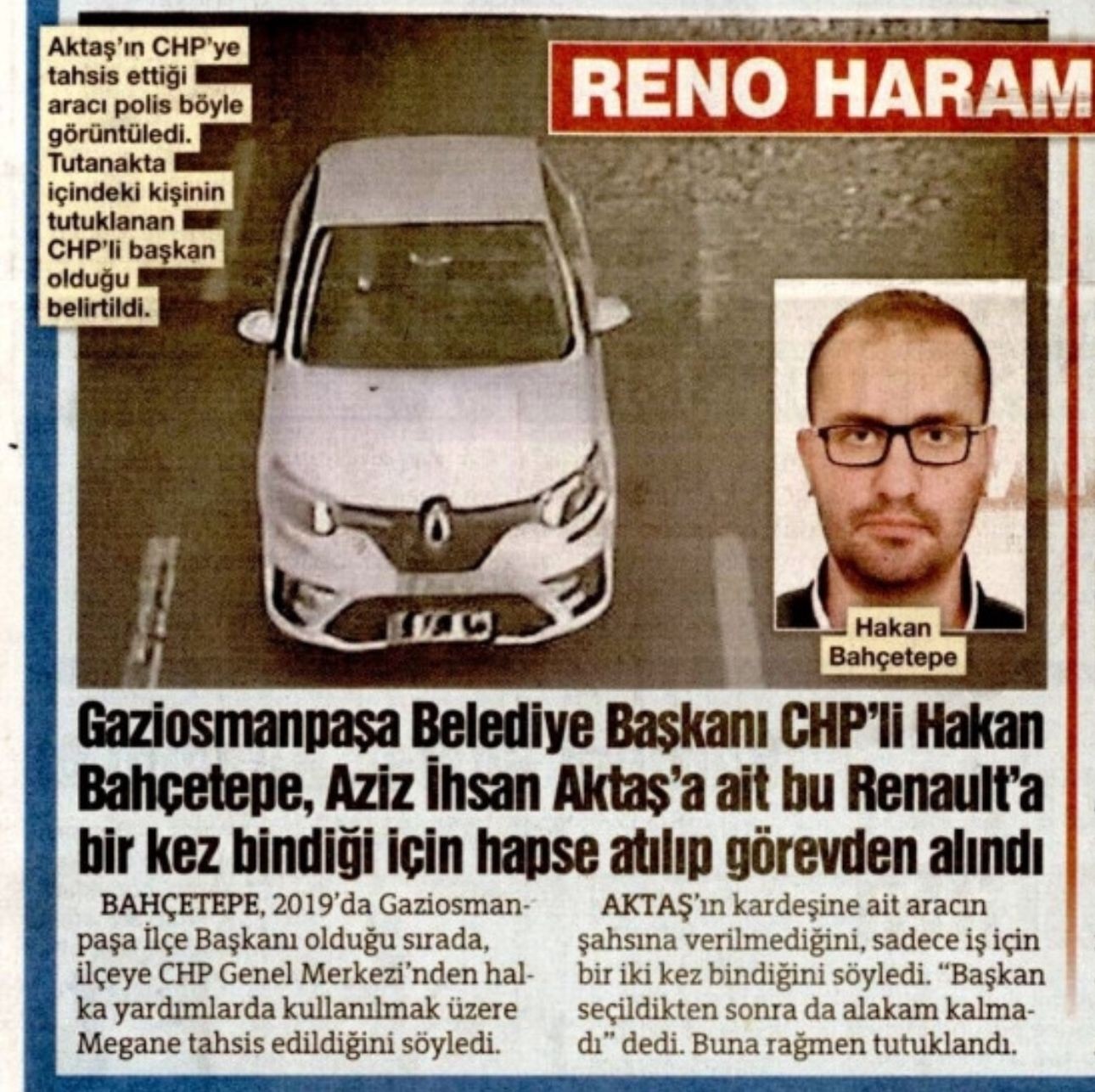 Sözcü, Gaziosmanpaşa Belediye Başkanı CHP’li Hakan Bahçetepe’nin, yolsuzluk soruşturmasında ifade veren itirafçı Aziz İhsan Aktaş’ın tahsis ettiği Renault marka araçla şehir turu attığını belgeleriyle yayınladı. Üstelik, “Bu araçla sadece bir kere bindiği” iddiasını da gülünç hale getiren ayrıntılara yer verdi. Gazetenin manşetindeki fotoğraf, CHP’li başkanın bu aracı kullandığı ana dair emniyet görüntüsünü açıkça ortaya koydu.