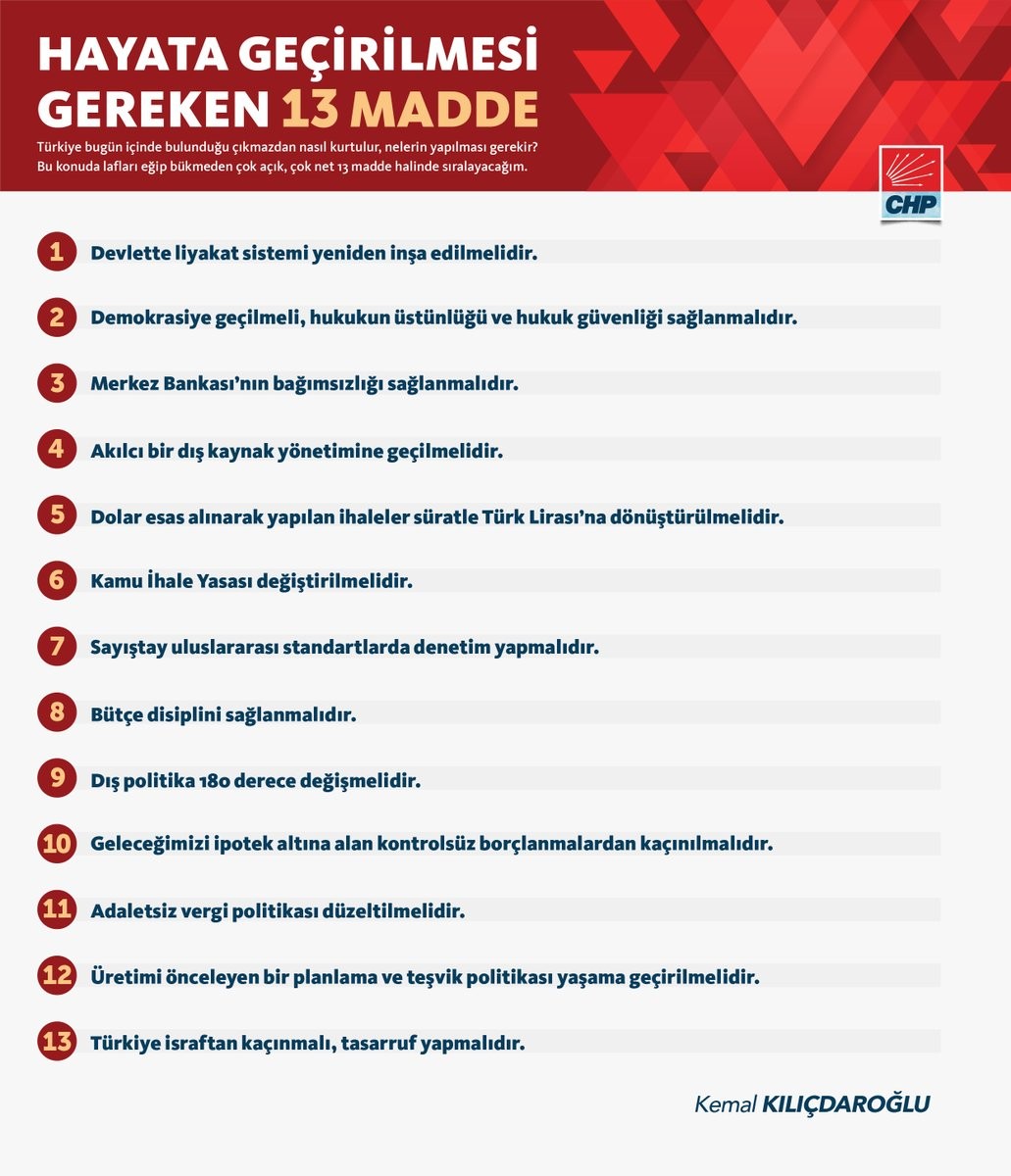 CHP liderinin "Türkiye bugün içinde bulunduğu çıkmazdan nasıl kurtulur, nelerin yapılması gerekir? Çözümü için hayata geçirilmesi gereken 13 maddeyi tekrar hatırlatıyorum!" notuyla paylaştığı 13 madde şu şekilde: