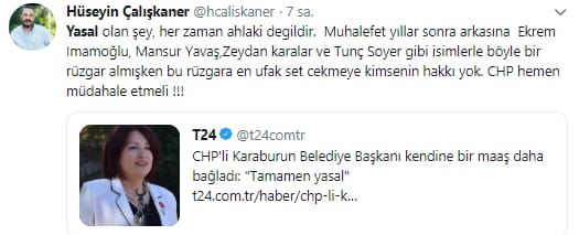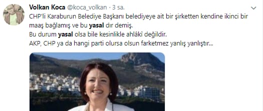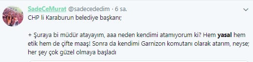 CHP’li İzmir Karaburun Belediye Başkanı Av. İlkay Girgin Erdoğan, kendini belediye iştiraki bir şirkete müdür olarak atamış ve çifte maaş almaya başlamıştı. Yaptığı bu işlem üzerine milletin tepkisini çeken CHP'li Başkan, yaptığı açıklamada kullandığı “Atanmam tamamen yasal” ifadeleriyle de twitter kullanıcılarının eleştiri odağı oldu.