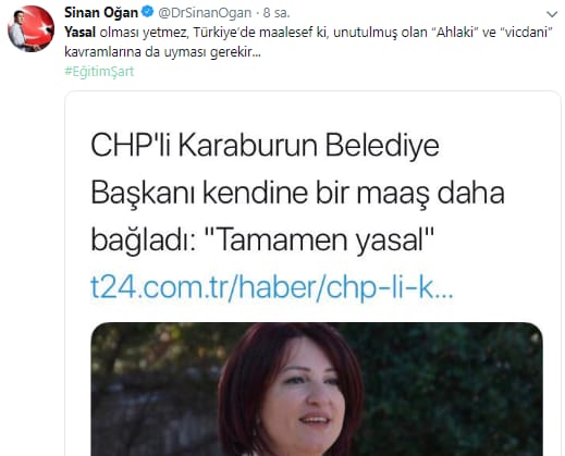 Sinan Oğan da , twitter hesabından paylaştığı mesajı ile CHP'li Başkanı eleştirerek,“Yasal olması yetmez, Türkiye’de maalesef ki unutulmuş olan “ahlaki” ve “vicdani” kavramlara da uyması gerekir.” ifadelerini kullandı.