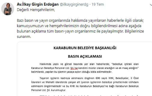 CHP Karaburun Belediye Başkanı Av. İlkay Girgin Erdoğan belediye iştiraki şirkete müdür olarak atanmasının ardından çektiği tepkiler üzerine yazılı açıklama yaparak, “Hakkımda iddia edilen belediye iştirakine müdür olarak atanmam tamamen yasal olup bu görev şahsıma Karaburun Belediye Meclis kararı ile verilmiştir.” ifadelerini kullanmıştı.