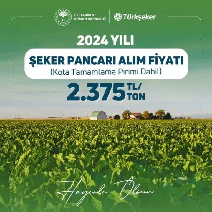 Türkşeker tarafından 2024 yılı şeker pancarı alım fiyatı kota tamamlama primi ile birlikte ton başına 2 bin 375 lira olarak belirlendi.