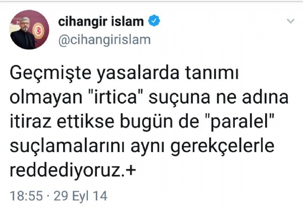 İslam, Cumhurbaşkanı Recep Tayyip Erdoğan'ın 'paralel' ile mücadeleyi başlattığı tarihlerde FETÖ'ye methiyeler diziyordu. Cihangir İslam, Akit Tv canlı yayınında kendisine paylaştığı FETÖ mesajları hatırlatılınca stüdyoyu terk etmişti.