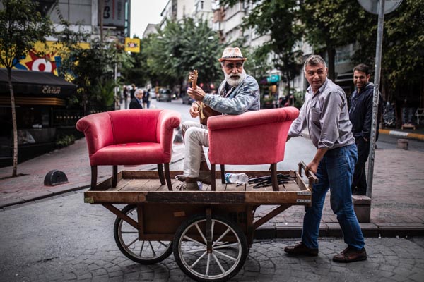 İstanbul Cihangir'de bir hurdacının el arabası üzerindeki koltuklara oturan sokak müzisyenine ilgi büyüktü.