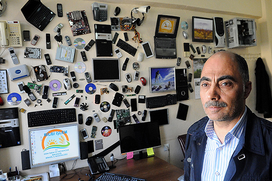 Bingöl Gıda Tarım ve Hayvancılık İl Müdürlüğünde bilgi işlem görevlisi olarak çalışan Engin Gürbüz (48), bilgisayardan çıkan atık parçaları, eski model telefonları "Teknoloji duvarı" adını verdiği çalışma odasının duvarında sergiliyor.