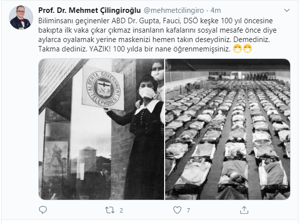 DSÖ ve ABD'li yetkilileri eleştiren Prof. Dr. Mehmet Çilingiroğlu yaptığı açıklamada, "Biliminsanı geçinenler ABD Dr. Gupta, Fauci, DSÖ keşke 100 yıl öncesine bakıpta ilk vaka çıkar çıkmaz insanların kafalarını sosyal mesafe önce diye aylarca oyalamak yerine maskenizi hemen takın deseydiniz. Demediniz. Takma dediniz. YAZIK! 100 yılda bir nane öğrenmemişsiniz." dedi.