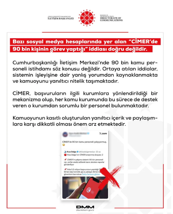 “Bazı sosyal medya hesaplarında yer alan ‘CİMER’de 90 bin kişinin görev yaptığı’ iddiası doğru değildir. Cumhurbaşkanlığı İletişim Merkezi’nde 90 bin kamu personeli istihdamı söz konusu değildir. Ortaya atılan iddialar, sistemin işleyişine dair yanlış yorumdan kaynaklanmakta ve kamuoyunu yanıltıcı nitelik taşımaktadır.”