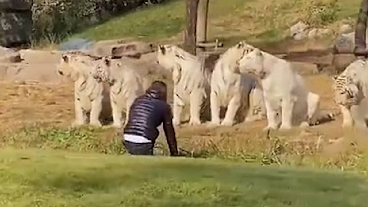 11 beyaz kaplana karşı tek başına duran turist, kaplanları kışkırtmak için sesler çıkarmaya başladı.