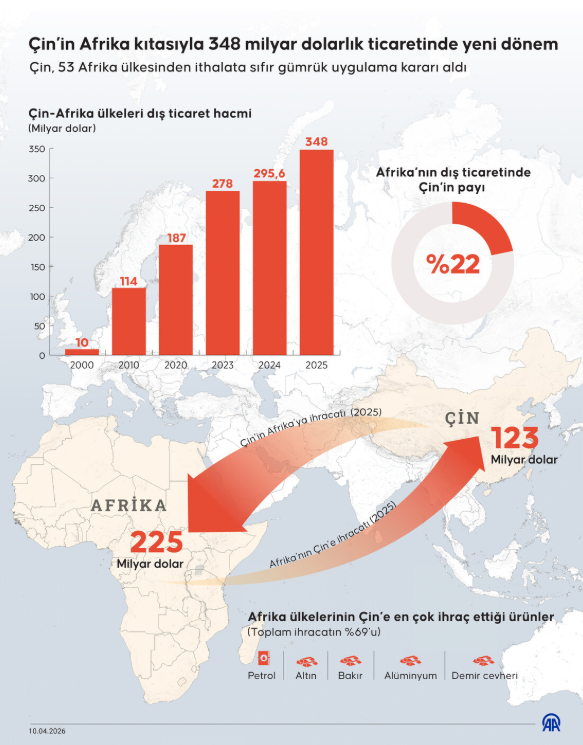 Çin ile Afrika arasındaki ticaret hacmi son yıllarda hızlı bir artış gösteriyor. 2000’de sadece 10 milyar dolar seviyesinde olan toplam ticaret, 2023’te yaklaşık 278 milyar dolara, 2025’te ise 348 milyar dolara yükseldi. Bu artış, taraflar arasındaki ekonomik ilişkilerin ne kadar derinleştiğini ortaya koyuyor. Çin, Afrika’nın en büyük ticaret ortağı konumunu sürdürürken, kıtanın ihracatında da ilk sırada yer alıyor.