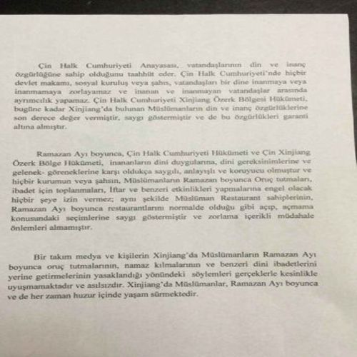 Çin iş dünyasının Türkiye'deki temsilcileri, son günlerde Uygurlar'ın oruç ve ibadetlerine yönelik baskılar olduğu yönünde ülkelerine yönelik tepkilere karşı harekete geçti. Çin'in demir-çelik sektöründe maden çıkarma dahil bütün üretim ve pazarlama aşamalarında faaliyet gösteren devlet şirketi Sinosteel'in Türkiye temsilcisi Li Song, ilişkide olduğu iş çevrlerine mektup gönderdi. Song mektubunda, "Asılsız haberler inanmmayın. Hükümet, Müslümanların Sincan Uygur Özerk Bölgesi'nde oruç tutma, ibadet için toplanma, iftar ve benzeri etkinlikleri yapmalarına engel olacak hiçbir şeye izin vermez" dedi. Mektubunda Çin Anayasası'nın din ve inanç özgürlüğünü düzenleyen maddelerini anlatan Song, "Hiçbir devlet makamı, sosyal kuruluş veya şahıs, vatandaşları bir dine inanmaya veya inanmamaya zorlayamaz" ifadesini kullandı. Song, mektubunu "Sincan'da Müslümanlar, ramazan ayı boyunca ve her zaman huzur içinde yaşam sürdürmektedir" diyerek bitirdi.