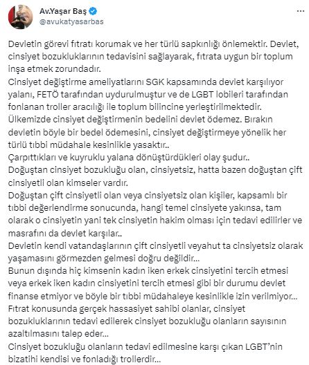 Hukukçular Birliği Vakfı Genel Başkan Yardımcısı Avukat Yaşar Baş, cinsiyet değiştirmek isteyenlerin ameliyatının SGK kapsamında devlet tarafından karşılandığına dair iddiaların yalan olduğunu belirtip bunun FETÖ'cüler tarafından uydurulduğunu söyledi. Baş, doğuştan cinsiyetsiz olanlar veya çift cinsiyetli olanların tedavisinin devlet tarafından karşılandığını ve bu tedaviyi de LGBT lobilerinin istemediğini ifade ederek önemli açıklamalarda bulundu.