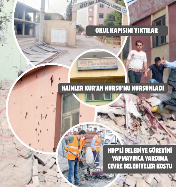 Cizre'deki cadde ve sokaklarda hendekler kazıp, kurdukları mayınlı barikatlarla günlük yaşamı adeta felç eden PKK'lı teröristler, eğitim kurumlarını da hedef aldı. Teröristlerin ilçedeki, Kur'an kursu, okul binası ile öğrenci yurtlarına da saldırdığı ortaya çıktı. Cudi Mahallesi'ndeki Cizre Müftülüğüne bağlı yatılı kız Kur'an kursu binası kurşun delikleriyle dolu. Atatürk Anadolu Lisesi'nin dış kapısı da teröristlerce barikat olarak kullanılmak üzere sökülmüş. İşyerlerini açan esnaf, çürüyen et, sebze ve meyveler ile kuru gıdaları çöpe attı. İlçede biriken çöp dağlarını, çevre il ve ilçe belediyelerinden gelen ekiplerin de desteğiyle toplanmaya başlandı.