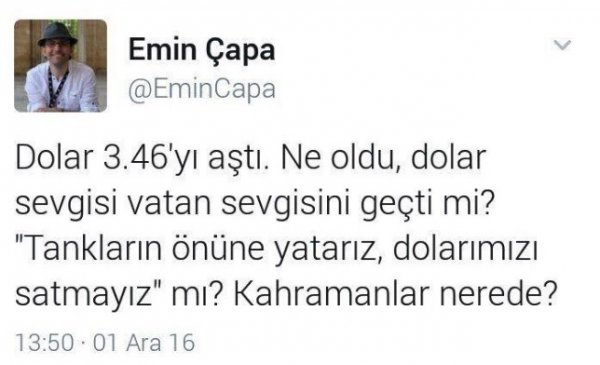 "Tankların önüne yatarız, dolarımızı satmayız" cümlesiyle 15 Temmuz gecesi darbeye direnenleri küçümseyen Çapa gelen tepkiler üzerine 'yanlış' anlaşıldığını belirterek tweet'ini silip, özür bile dilememişti.