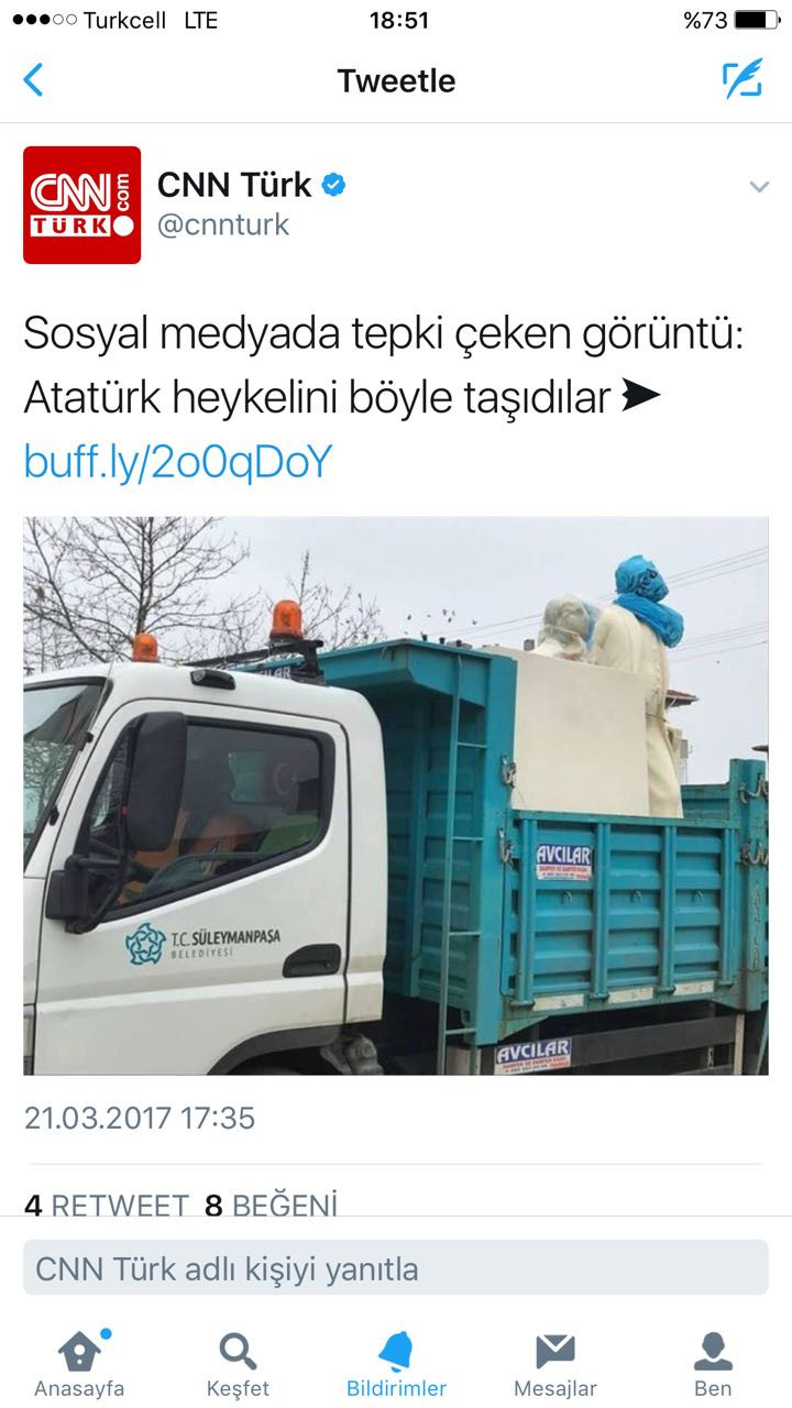 'Tarafsız' olduğunu iddia eden CNN Türk, CHP'li Tekirdağ Süleymanpaşa Belediyesi'nin Atatürk büstüne çöp poşeti geçirmesi haberini sildi.