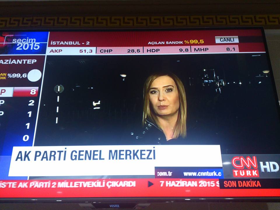 YENİAKİT.COM.TR CNN Türk'te Mirgün Cabas ve Ahmet Hakan Coşkun'un seçim sonuçlarını değerlendirdiği programda, AK Parti Genel Merkezi önündeki muhabirine bağlandılar. Muhabir canlı yayında programa bağlandığı sırada AK Partililerden 'Vur vur inlesin, Aydın Doğan dinlesin' sloganları yükseldi.