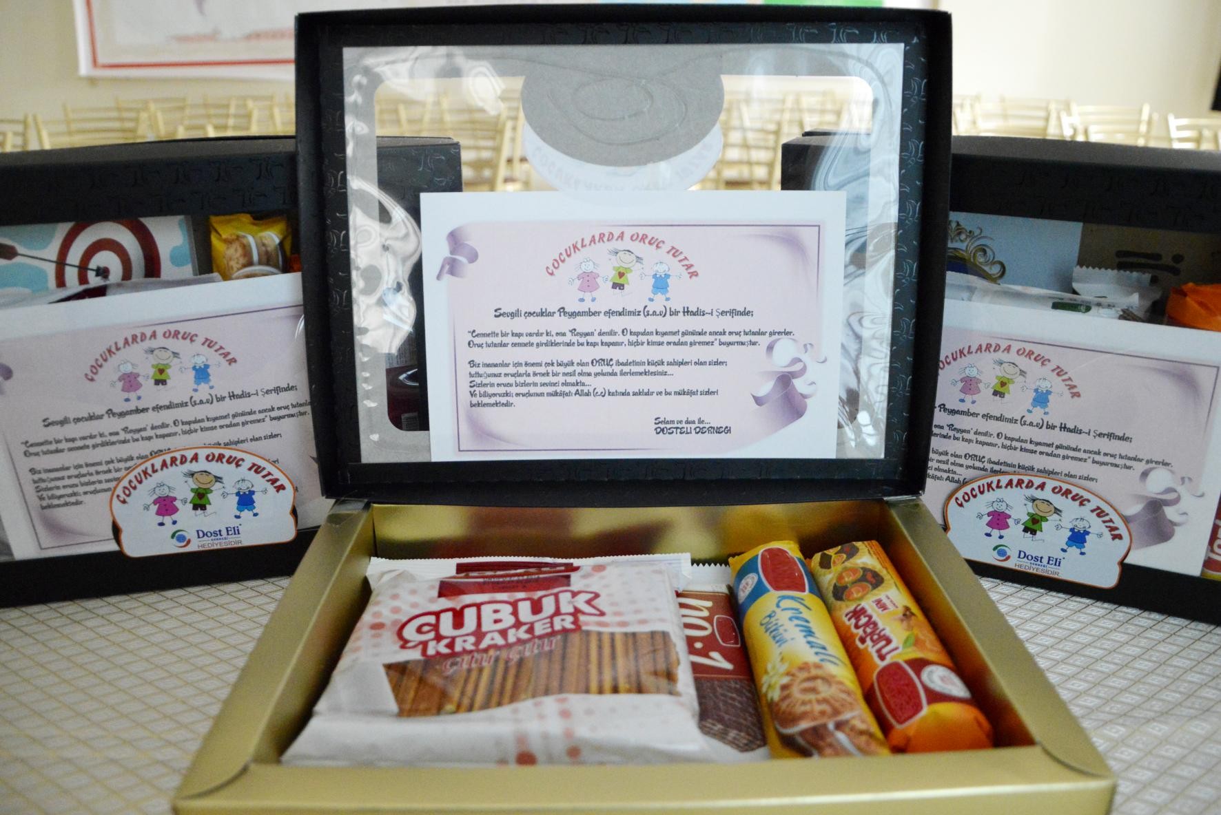 Konuyla ilgili bir açıklama yapan Dost Eli Derneği Yönetim Kurulu Başkanı Mehmet SEÇER; “Çocuk dünyasında var olan Ramazan ayı algısının manâ yönünü ön plana çıkararak kuvvetlendirmek ve bu bilincin yarınlara taşınması için çocuklara özel programlarımız devam etmekte. Bu yıl derneğimiz tarafından“Çocuklarda Oruç Tutar” sloganı ile oruç tutan çocuklara verilmek üzere içerisinde bisküvi, gofret, çikolata, şekerleme, hurma oyuncak ve bir hikâye kitabının yer alacağı hediye paketi hazırlanmakta. Hazırlanan bu paketler dernekten destek alan ailelerin çocuklarına dağıtılmaktadır” dedi.