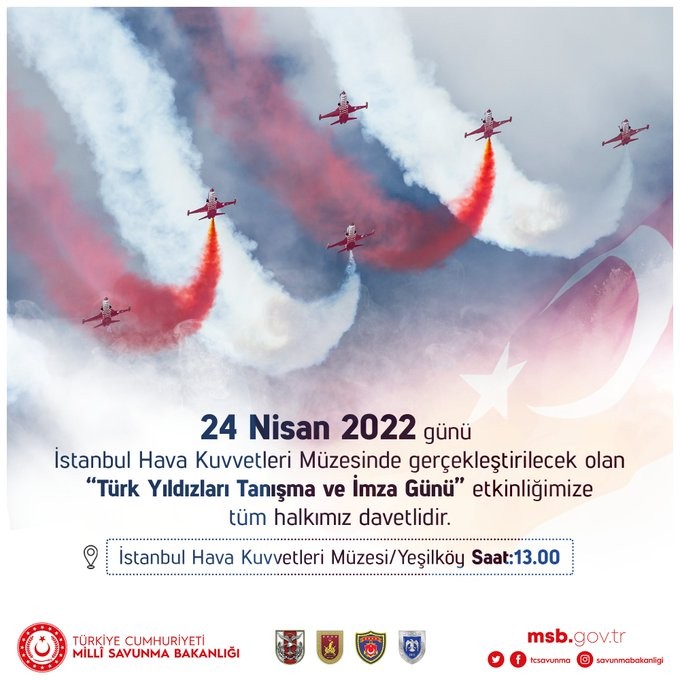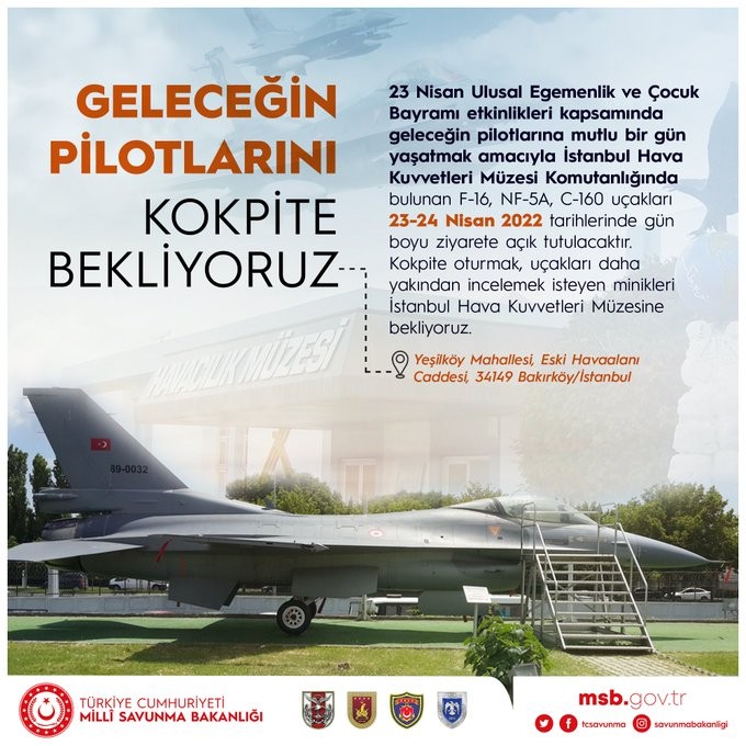 Milli Savunma Bakanlığı sosyal medya hesabından yaptığı paylaşımla 23 Nisan Ulusal Egemenlik ve Çocuk Bayramı etkinlikleri çerçevesinde çocukları F-16’larla tanıştırırken aynı zamanda, Türk Yıldızları Tanışma ve İmza Günü’ne de katılabilme imkanı sağlıyor. Bakanlıktan yapılan açıklamada, “23 Nisan Ulusal Egemenlik ve Çocuk Bayramı etkinlikleri kapsamında geleceğin pilotlarına mutlu bir gün yaşatmak amacıyla İstanbul Hava Kuvvetleri Müzesi Komutanlığımızdaki F-16, NF-5A, C-160 uçaklarını ziyarete açıyoruz. 24 Nisan 2022 günü de İstanbul Hava Kuvvetleri Müzesinde düzenlenecek ‘Türk Yıldızları Tanışma ve İmza Günü’ etkinliğine tüm halkımız davetlidir.” ifadeleri kullanılarak, etkinliğin yapılacağı adrese ilişkin bilgilere yer verildi.