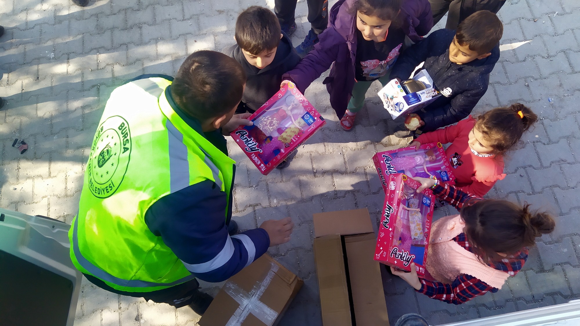 Hatay’da deprem mağduru vatandaşların yaralarını sarmak için köy köy mahalle mahalle gezen Bursa Büyükşehir Belediyesi ekipleri, depremzede çocukları da ihmal etmiyor. Yardım dağıtım noktalarında anne-babalara gıda, yiyecek ve yakacak gibi temel ihtiyaç maddeleri verilirken, çocuklara da oyuncak dağıtılıyor.