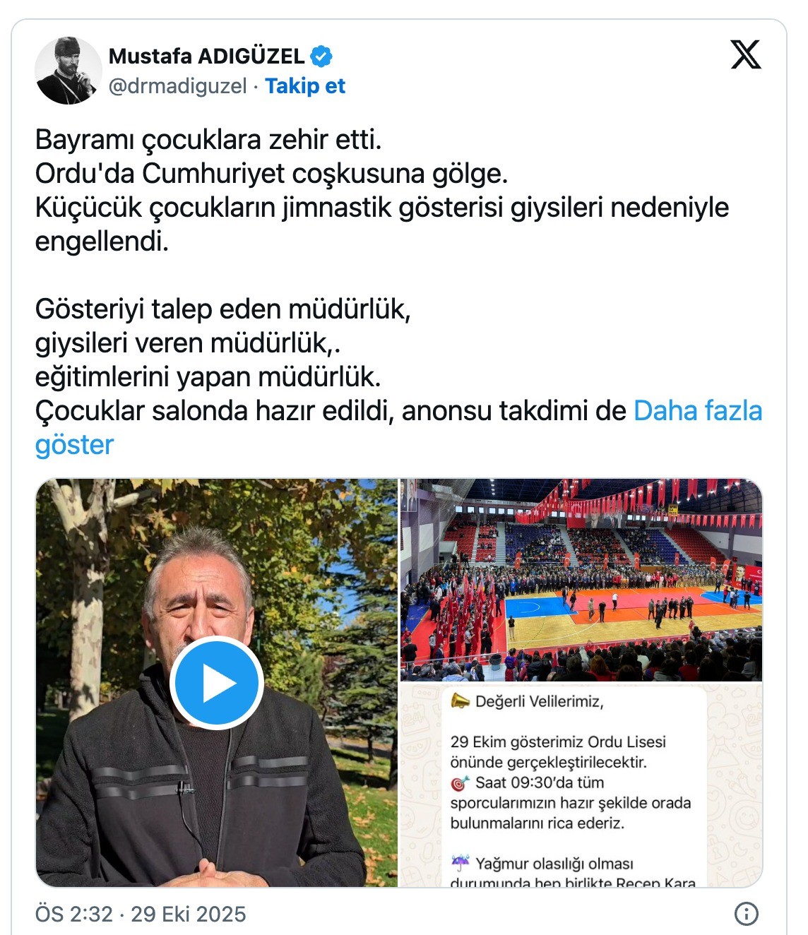 Partisinde yıllardır yaşanan cinsel taciz ve gayri ahlaki ilişkileri görmezden gelen CHP Ordu Milletvekili Mustafa Adıgüzel, Ordu’da 29 Ekim Cumhuriyet Bayramı kutlamaları sırasında çocukların jimnastik gösterilerinin iptal edilmesi kararı ile ilgili olarak ‘sapık zihniyetin tezahürü’ ifadelerini kullandı.