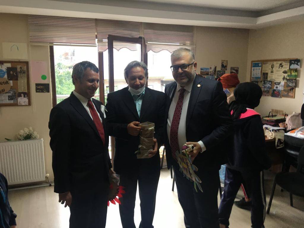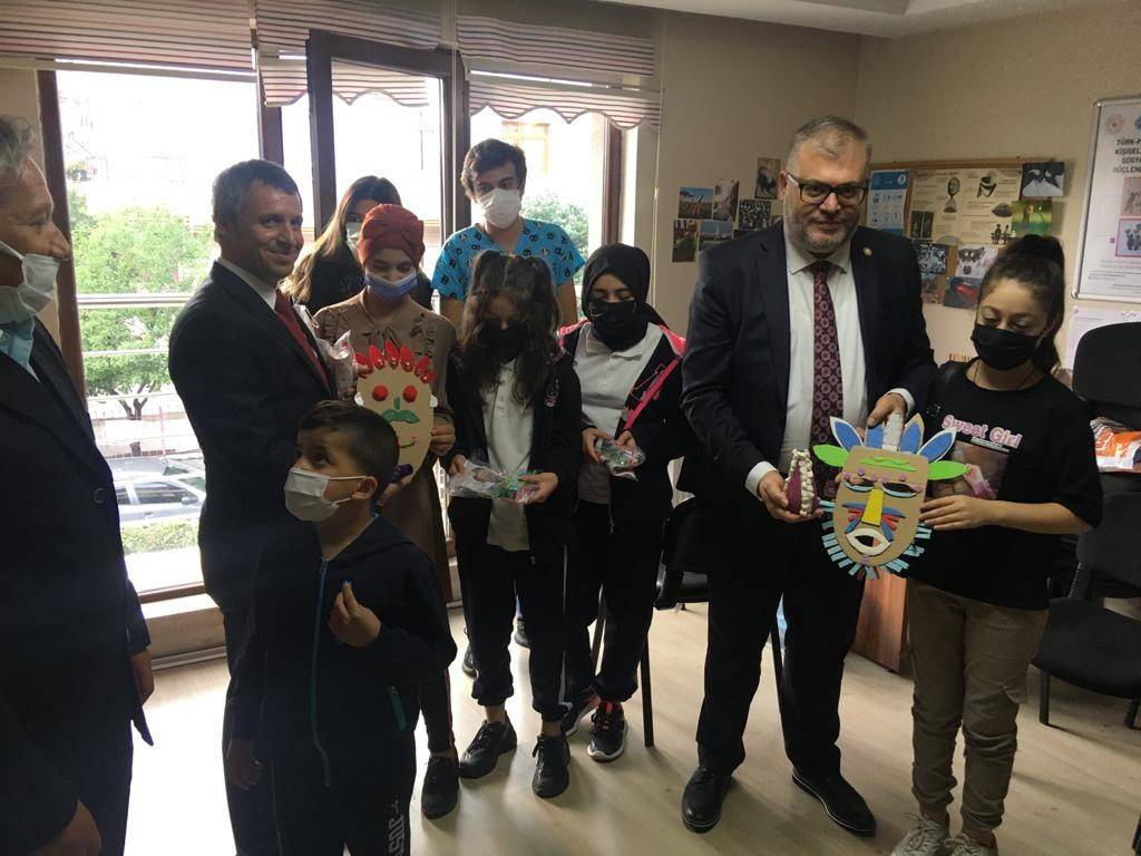 Ziyaret bitiminde diş taraması yapılan çocuklara ağız temizlik setleri hediye edilirken, çocuklar da dernek faaliyetlerinde yaptıkları resim ve maskelerden konuklara hediye ettiler.
