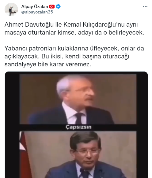 Özalan'ın paylaştığı videoda, Kılıçdaroğlu'nun Davutoğlu'na, "Ahmet Davutoğlu Cumhuriyet tarihinin gelmiş geçmiş en çapsız bakanıdır." dediği anlar ile Davutoğlu'nun Kılıçdaroğlu'na yönelik, "Ben de ona diyorum ki, adam olana adam gibi cevap verilir. Ben onu adam sınıfından da sayamıyorum, adam müsveddesi demeyi bile kendisine çok görüyorum." ifadeleri yer aldı.