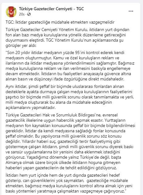 Yurt dışından fon alan bazı medya kuruluşlarına yönelik düzenleme getireceği haberlerinin arından yazılı bir açıklama yapan TGC, söz konusu düzenlemeyi "gazeteciliğe müdahele" olarak nitelendirdi.