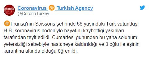 Yapılan açıklamalara ve tedavi sürecindeki hastaların sonuçlarına göre Trükiye'de corona virüsüne rastalanmadı. Fakat Fransa'da yaşayan 66 yaşındaki H.B. corona virüsü sebebiyle hayatını kaybeden ilk Türk oldu. Eşi ve çocuklarının karantina altında olduğu bilinen H.B.'in cenazesinin, bulaşma nedeniyle aileye verilmediği öğrenildi.
