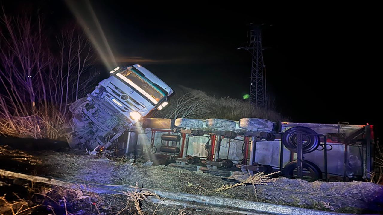 Mehmet H. yönetimindeki 33 AGS 784 plakalı tır, sürücüsünün kontrolü kaybetmesi sonucu dere yatağına devrildi.
