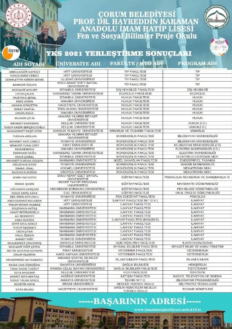 Çorum Belediyesi Prof. Dr. Hayrettin Karaman Anadolu İmam Hatip Lisesi Fen ve Sosyal Bilimler Proje Okulu'ndan mezun 58 öğrenci, Türkiye'nin önemli üniversitelerine yerleşerek, yine büyük bir başarıya imza attı.