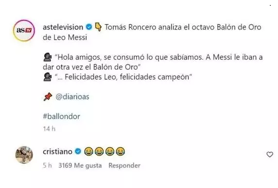 Instagram üzerinden Lionel Messi'nin Ballon d'Or ödülünü almasını eleştiren bir paylaşıma Cristiano Ronaldo'nun beğeni ve yorum göndermesi gündem oldu.