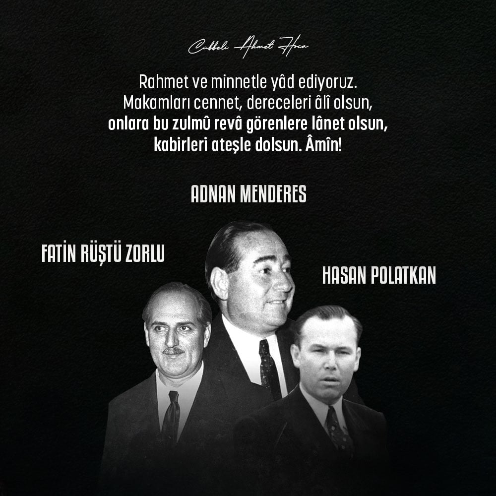"Ali Haydar Efendi Hazretleri’mizin, hakkında: “Beş vakit namazın ardından Menderes’e duâ etmeyenin namazı kabûl olunmaz. Benim gibi binlerce Ali Haydar’ın tekke köşelerinde sabaha kadar zikir yapmalarındansa Menderes’in mecliste bir kere Allâh demesi daha fazîletlidir.” buyurduğu Yüce şehîtlerimiz Adnan Menderes, Fatin Rüştü Zorlu ve Hasan Polatkan’ı rahmetle ve minnetle yâd ediyoruz." diyen Cübbeli Ahmet Hoca sözlerini şöyle tamamladı: