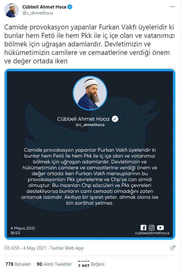 "Furkan Vakfı mensuplarının bu provokasyonları Pkk çevrelerine ve Chp’ye can simidi olmuştur. Bu insanları Chp sözcüleri ve Pkk çevreleri destekliyorsa bunların cami cemaati olmadığını zaten anlamak lazımdır. Akıllıya bir işaret yeter, ahmak olana ise bin sarâhat yetmez."