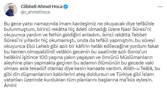92 yaşında hayatını kaybeden Soros'la ilgili sosyal medya hesabından paylaşımda bulunan Cübbeli Ahmet Hoca, dikkat çeken ifadeler kullandı.
