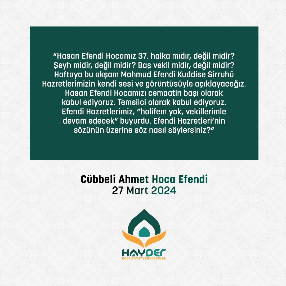 Açıklamada, "Bir süredir kendisiyle yapılan istişarelere rağmen tavrını değiştirmemekte ısrar eden, ihvânımızı ve kamuoyunu yanlış biçimde yönlendirmeyi sürdüren Cübbeli Ahmet Hoca, söz ve davranışlarıyla tarîkatımıza ve hizmetlerimize zarar veren biri hâline gelmiş ve Hasan Efendi (Kuddise Sirruhû) Hazretlerimizin şeyhliğini kabul etmemiştir. Bu gerçeğe binaen kendisinin tekkemiz ve cemaatimizle hiçbir ünsiyetinin kalmadığını, görüş ve açıklamalarının cemaatimiz açısından hiçbir bağlayıcılığının bulunmadığını ihvânımıza ve tüm kamuoyuna saygıyla duyururuz." denildi.