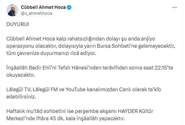 DUYURU! Cübbeli Ahmet Hoca kalp rahatsızlığından dolayı şu anda anjiyo operasyonu olacaktır, dolayısıyla yarın Bursa Sohbeti'ne gelemeyecektir, tüm çevrenize duyurmanızı rica ediyor.