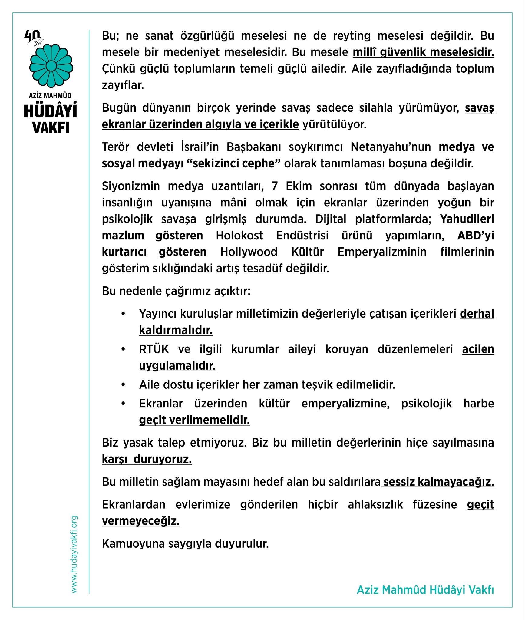 Toplumun temel taşı olan aile yapısının; sadakatsizlik güzellemeleri, çarpık ilişkiler ve mahremiyeti hiçe sayan programlarla hedef alındığı belirtilen açıklamada, RTÜK ve ilgili kurumlara acil müdahale çağrısı yapıldı. Değerlerini yitiren toplumların yıkılmaya mahkûm olduğu hatırlatılarak, bu kültür bombardımanına karşı topyekün bir duruş sergilenmesi gerektiği kaydedildi.