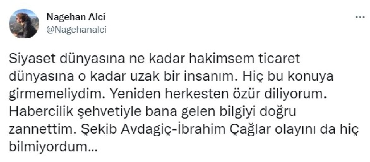 Siyaset dünyasına ne kadar hakimsem ticaret dünyasına o kadar uzak bir insanım. Hiç bu konuya girmemeliydim. Yeniden herkesten özür diliyorum. Habercilik şehvetiyle bana gelen bilgiyi doğru zannettim. Şekib Avdagiç-İbrahim Çağlar olayını da hiç bilmiyordum…"