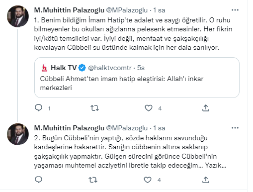 Cübbeli Ahmet Hoca'ya en sert tepki damadının ağabeyi Muhittin Palazoğlu'ndan geldi. "Benim bildiğim İmam Hatip'te adalet ve saygı öğretilir. O ruhu bilmeyenler bu okulları ağızlarına pelesenk etmesinler." diyen Palazoğlu, "Her fikrin iyi/kötü temsilcisi var. İyiyi değil, menfaat ve şakşakçılığı kovalayan Cübbeli su üstünde kalmak için her dala sarılıyor." ifadelerini kullandı.