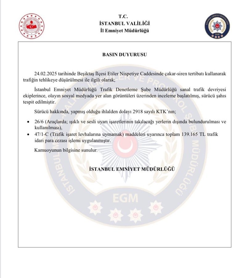 Kamuoyunun bilgisine sunulan açıklamada, ilgili ihlallerin 2918 sayılı Karayolları Trafik Kanunu'nun 26/6 ve 47/1-C maddelerine dayandırıldığı belirtildi. Bu cezayla birlikte Palazoğlu'na, trafik kurallarına uymamanın yol açtığı ciddi mali yükler hatırlatılmış oldu.