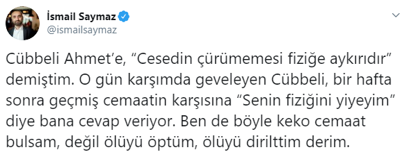 Saymaz, “Cübbeli Ahmet’e, ‘Cesedin çürümemesi fiziğe aykırıdır’ demiştim. O gün karşımda geveleyen Cübbeli, bir hafta sonra geçmiş cemaatin karşısına ‘Senin fiziğini yiyeyim’ diye bana cevap veriyor. Ben de böyle keko cemaat bulsam, değil ölüyü öptüm, ölüyü dirilttim derim.” diye yazdı.