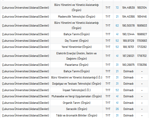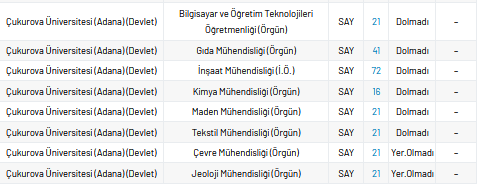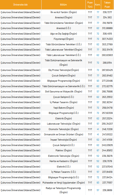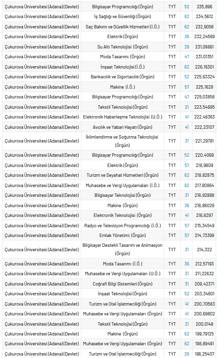 Çukurova Üniversitesi 2 yıllık taban puanları 2021, yüzdelik dilimleri ve kontenjan sayıları kaçtır?