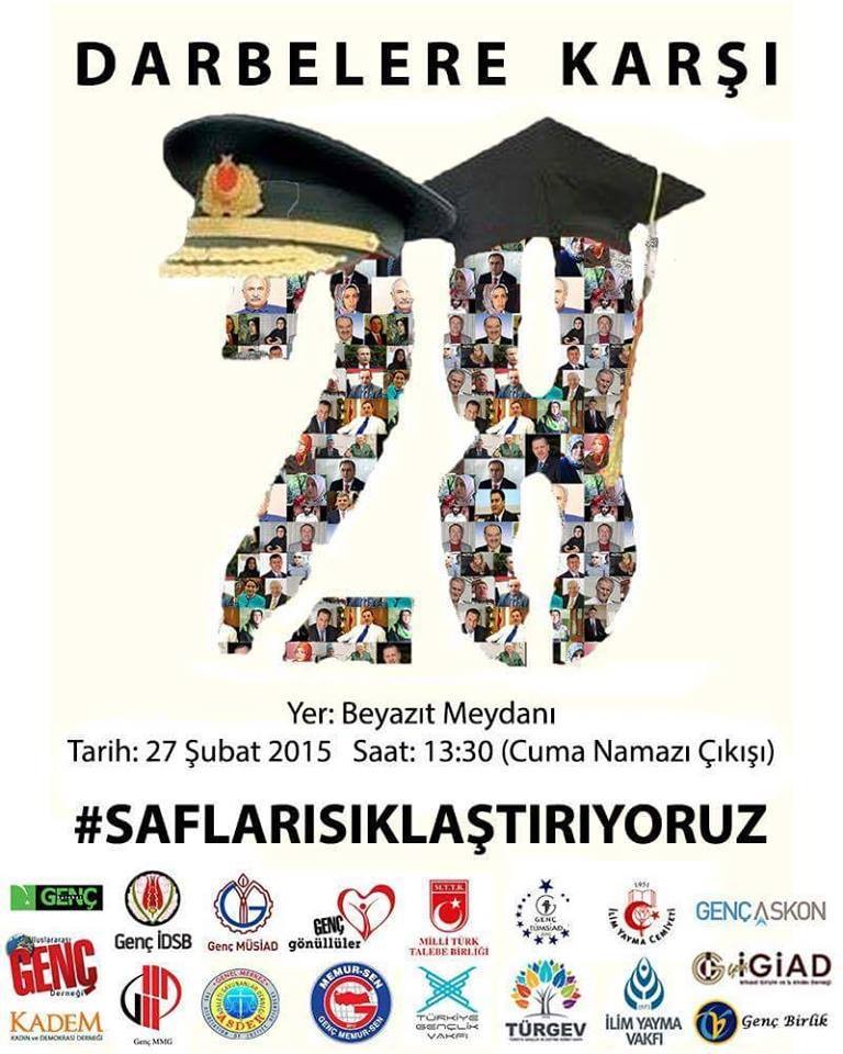 YENİAKİT.COM.TR - 'Darbelere karşı safları sıklaştırıyoruz' sloganıyla yola çıkan ve aralarında Genç Memur Sen, İlim Yayma Cemiyeti, MTTB ve TÜRGEV gibi çok sayıda kuruluşun bulunduğu birçok STK, 27 Şubat Cuma günü Saat 13.30'da Beyazıt Meydanı'nda toplanacak ve 28 Şubat'ı lanetleyecek.