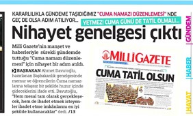 Milli Gazete, Müslüman toplumun gönlüne su serpecek bir öneride bulunarak memurlar için Cuma namazı izninin yetmeyeceğini Cuma gününün tümden tatil olması gerektiğini savundu.