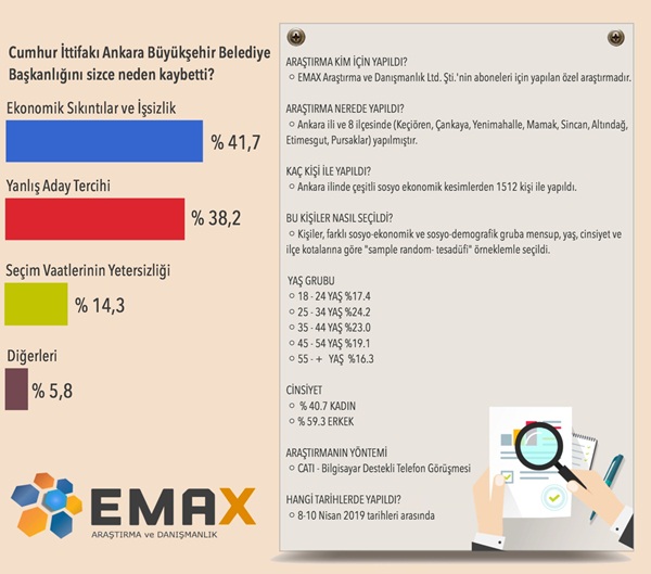 EMAX Araştırma Şirketi, 8-10 Nisan 2019 tarihleri arasında Ankara'da 1512 kişi ile önceden hazırlanmış soru formuna bağlı olarak (CATI) bilgisayar destekli telefonla anket yapma tekniğiyle siyasi gündem araştırması yaptı. Ankete katılanlara, "31 Mart'ta Ankara Büyükşehir Belediye Başkanlığı seçiminde Cumhur ittifakı neden kaybetti" diye soruldu. Kararsızlar dağıtıldıktan sonra tüm katılımcıların yüzde 41.7'si "ekonomik sıkıntılar ve işsizlik" dedi. Yüzde 38.2'si "yanlış aday belirleme", yüzde 14.3'ü "seçim vaatlerinin yetersizliği ve etkin kampanya yapılamaması" yüzde 5.8'i diğer nedenler( sert üslup, ideolojik görüşlerime yakın değil vs.) dedi.